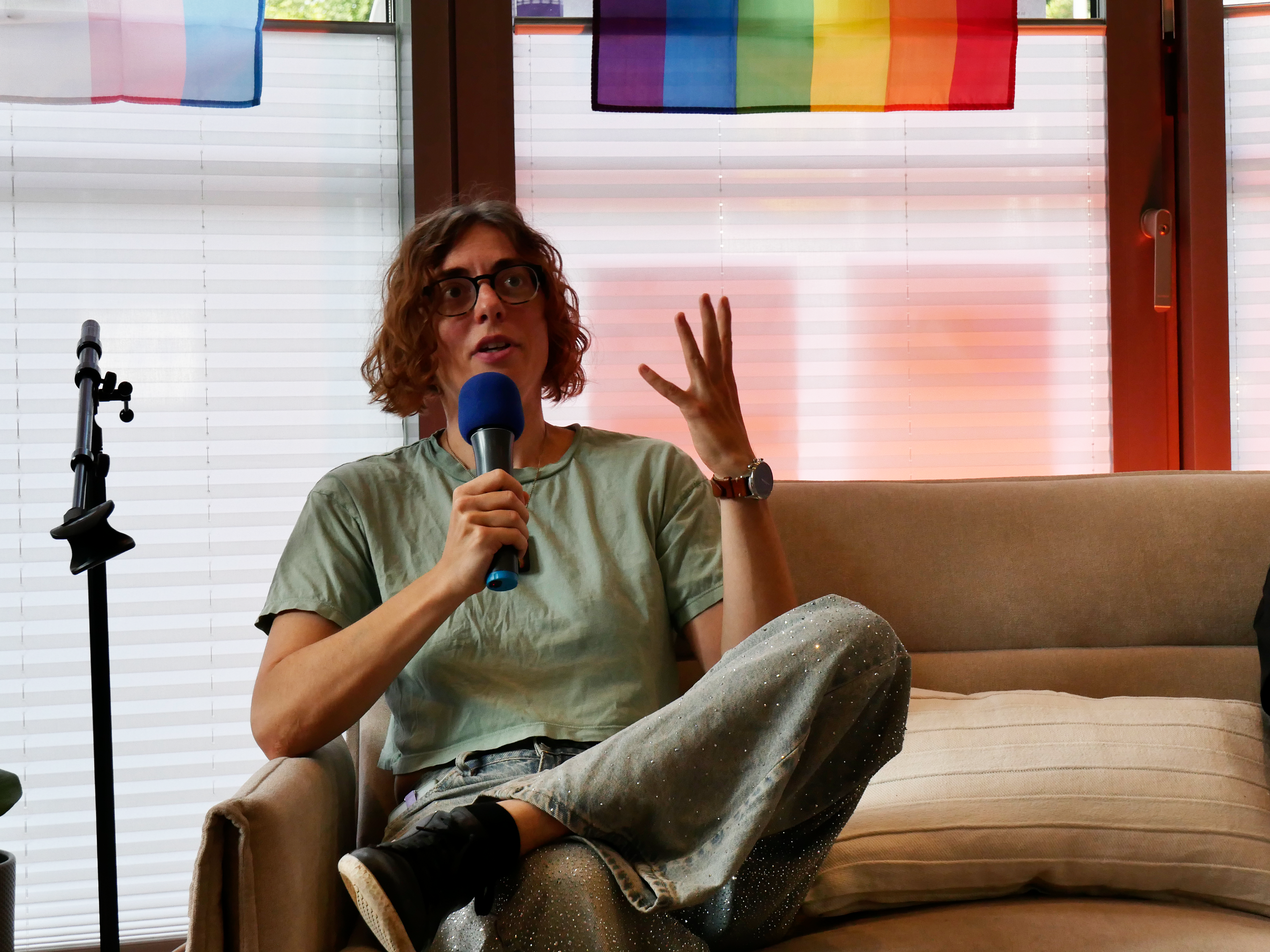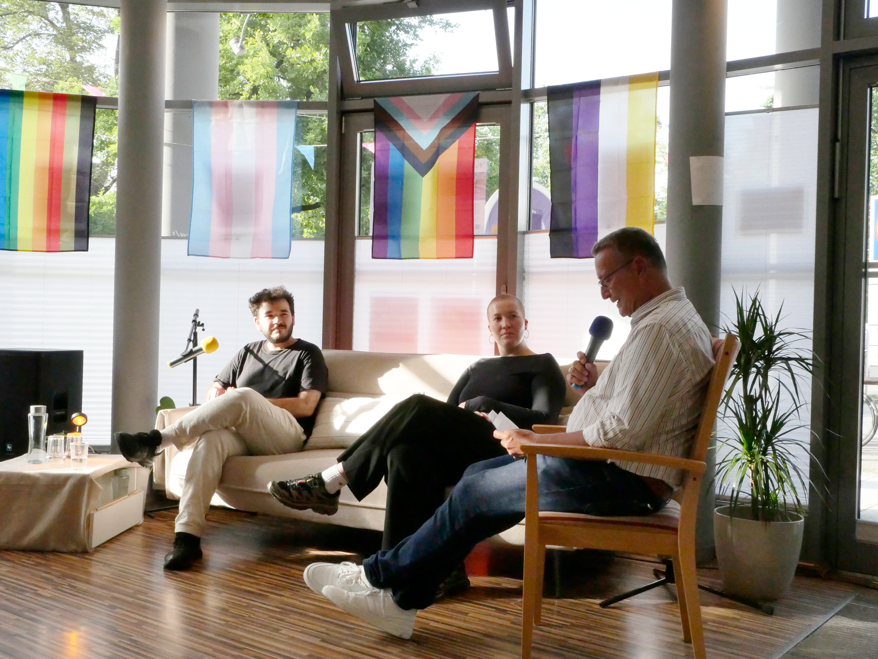 Nora Eckert und die Gäste stellten den Autor*innen anschließend zahlreiche Fragen zu ihren persönlichen Erfahrungen als queere Menschen, ihrem Aktivismus, zum Umgang mit Ausgrenzung und mit Versuchen, sie zum Schweigen zu bringen. Dabei ging es auch um eine Einschätzung der aktuellen politischen Situation sowie ihre Erwartungen und Wünsche an die Politik wie auch an die Gesellschaft. Als ganz wichtiges Element in der Unterstützung queerer Communities wurde die Solidarisierung und das Aktivwerden nicht-queerer Menschen genannt. In dieser Hinsicht, so Nora Eckert, war etwa der CSD in Budapest ein hoffnungsvolles Zeichen. Bei anschließenden Get together mit Getränken und Snacks hatten die Gäste des Abends weiter Gelegenheit zu Kennenlernen, Austausch und Begegnung.